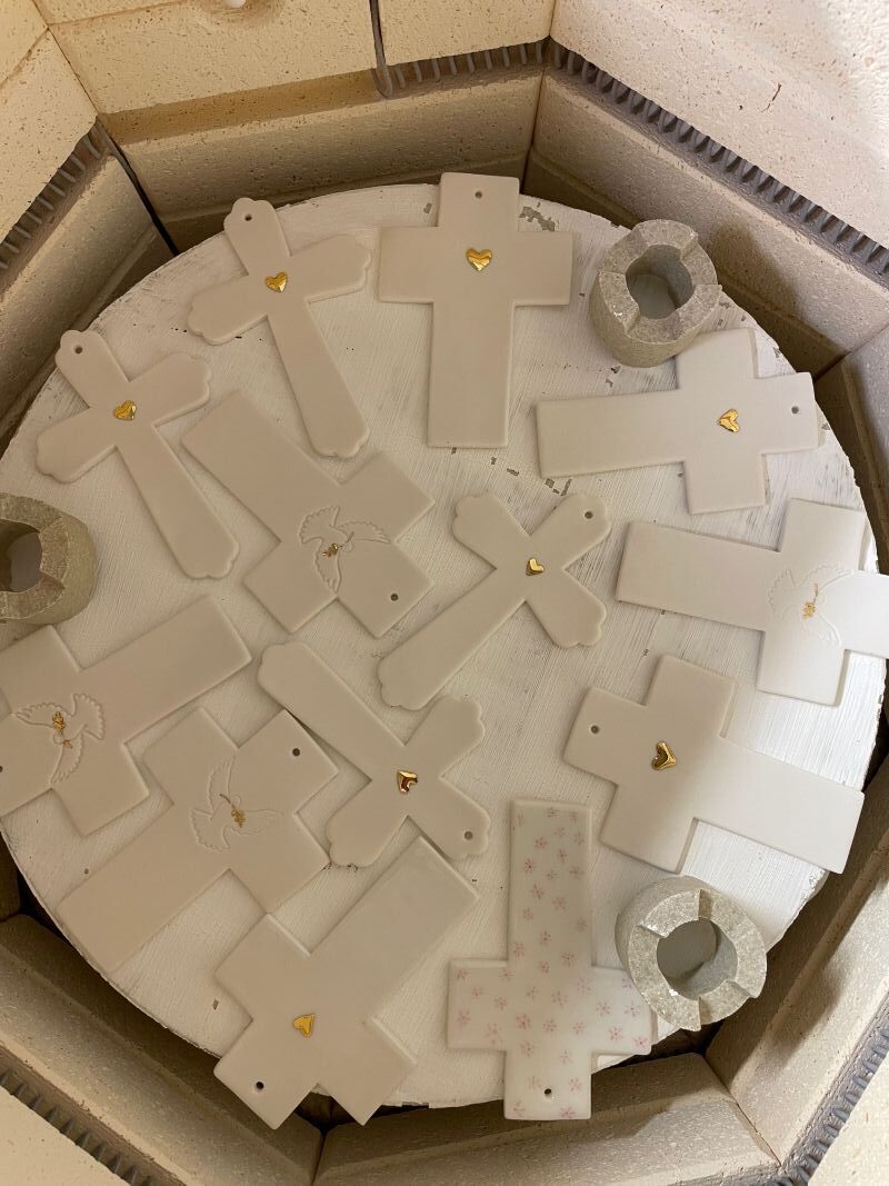 Une fois sèche, la pièce est cuite une première fois à environ 980°C. Cette cuisson, dite « de biscuit« , la solidifie et la prépare à recevoir l’émail.