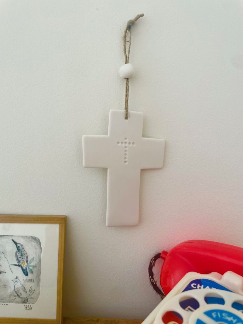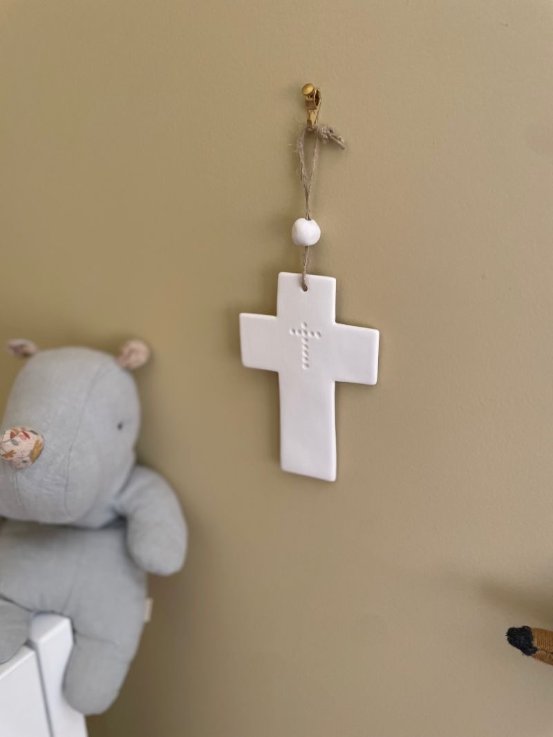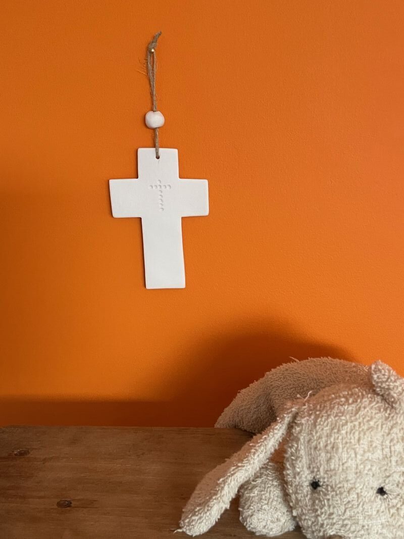 Croix en porcelaine non émaillée présente, en son centre, une croix discrète formée de ronds enfoncés dans la matière. Ce motif sobre et symbolique évoque une présence intérieure, à la fois discrète et profonde.