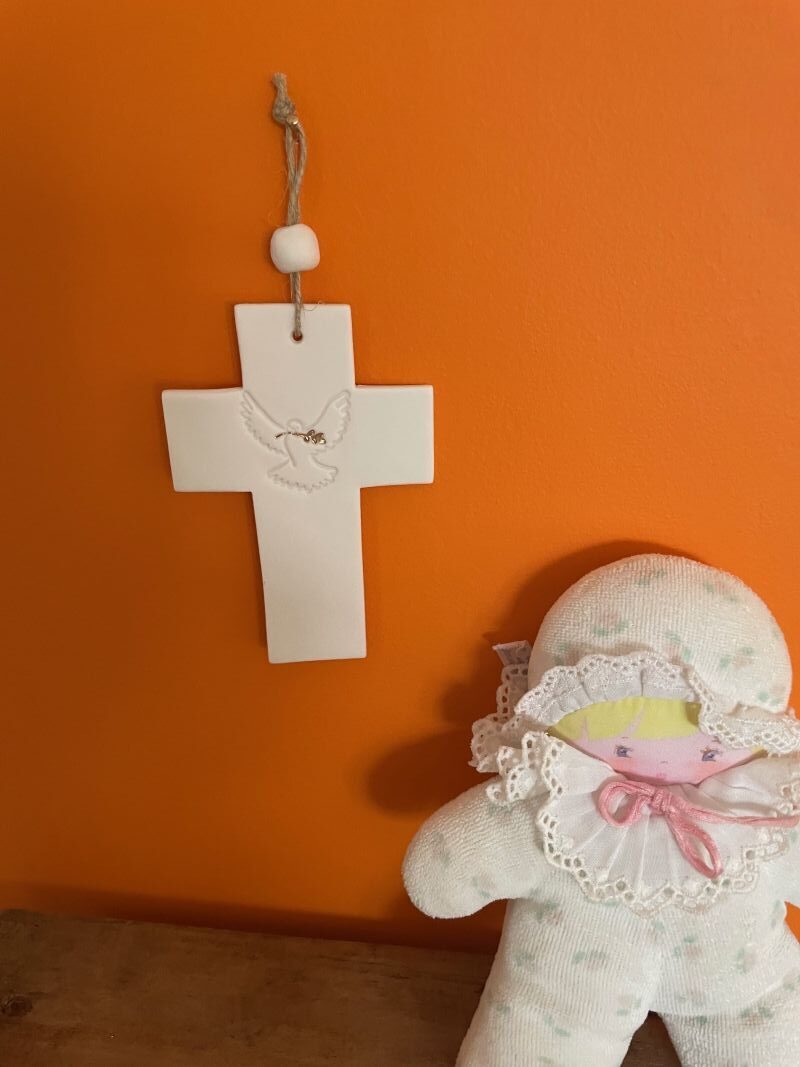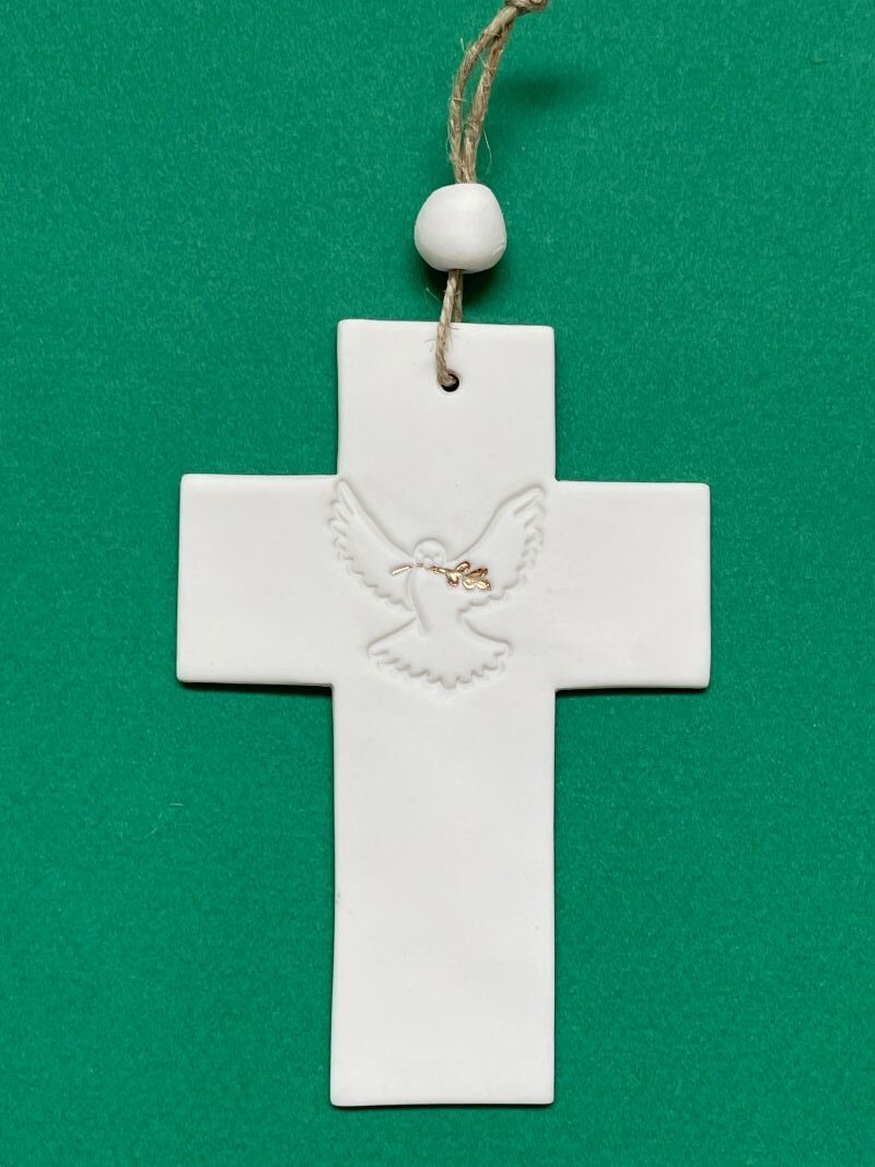 Croix latine en porcelaine non émaillée est ornée d’une colombe délicate portant un épi souligné d’or. Symbole de paix, de foi et d’abondance, elle incarne une présence douce et spirituelle.