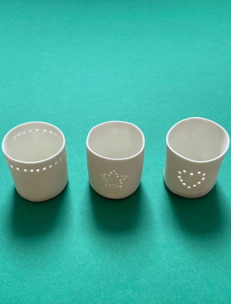 Ces lumignons délicats, sont conçus pour accueillir des bougies chauffe-plat, classiques ou LED. La lumière y danse avec douceur, traversant la finesse de la porcelaine pour révéler chaque décor. Chaque modèle est unique et laisse passer la lumière selon un motif différent : cœur, étoile, colombe, rayures, carré, ou encore bord perforé – pour une ambiance à la fois chaleureuse, poétique et pleine de charme. Fabriqué artisanalement dans mon atelier, chaque pièce est unique et peut présenter de légères irrégularités