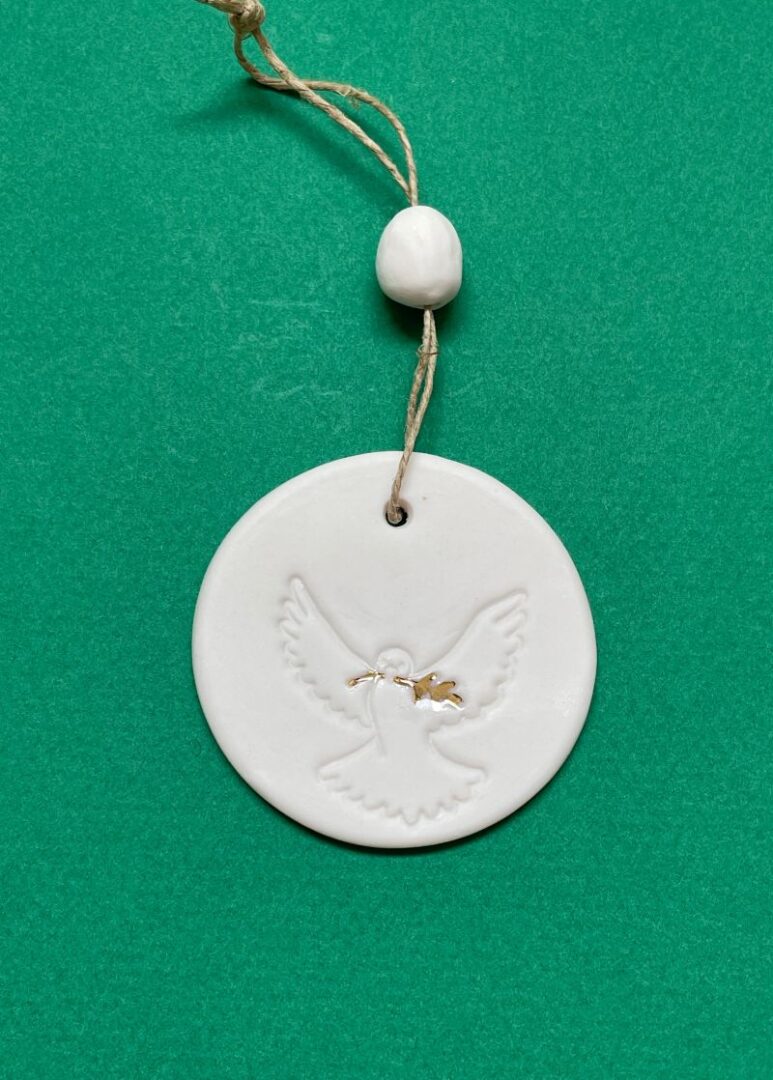 Un médaillon en porcelaine délicate, orné d'une colombe et d’un épi finement peint à la main à l’or.